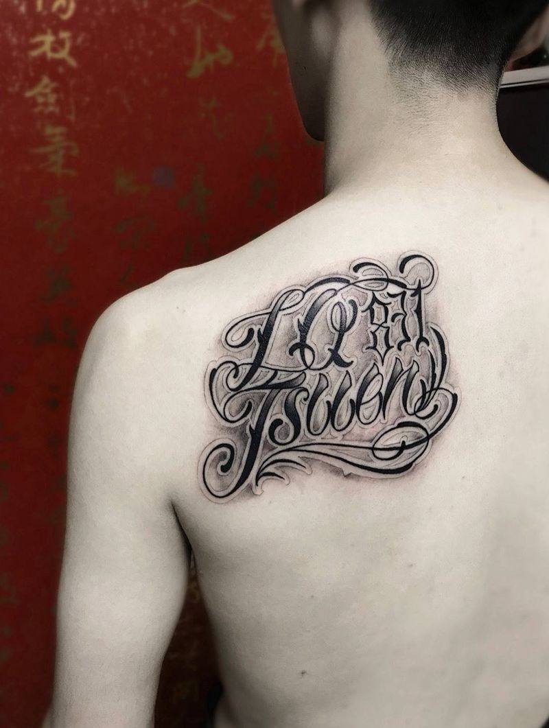 当前位置: 首页 >陕西省西安市纹身店-陕西同道堂文化传播有限公司纹身图案>原创字体纹身纹身图片_背部花体字原创纹图西安纹身图案