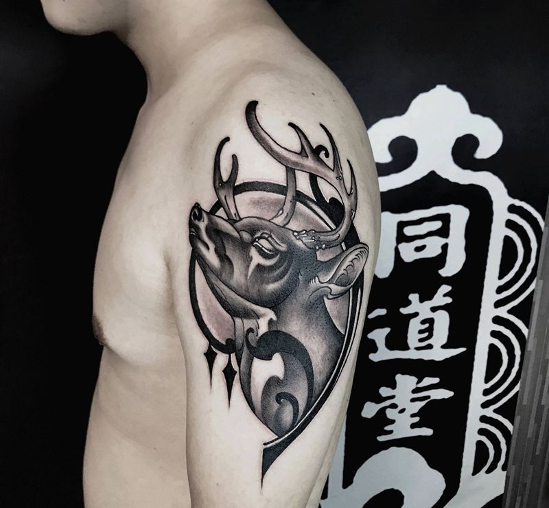 当前位置: 首页 >陕西省西安市纹身店-陕西同道堂文化传播有限公司纹身图案>鹿纹身图片_手臂新传统水墨纹身图案