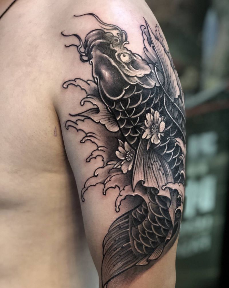 当前位置: 首页 >陕西省西安市纹身店-陕西同道堂文化传播有限公司纹身图案>大臂鲤鱼纹身纹身图片_手臂新传统纹身图案