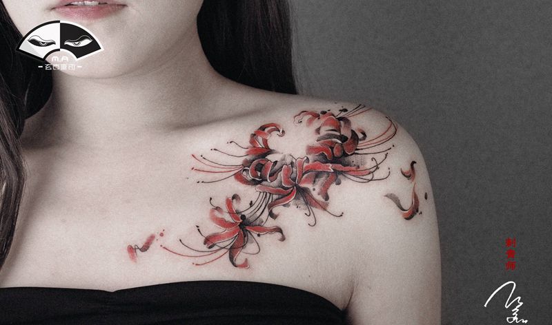 彼岸花纹身图片_肩部水墨纹身图案