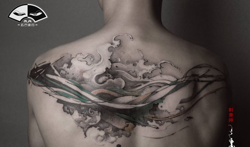 海浪纹身图片_背部水墨纹身图案