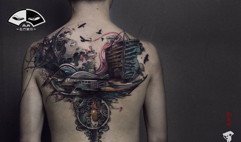 云帆寄沧海纹身图片_背部新传统水墨纹身图案