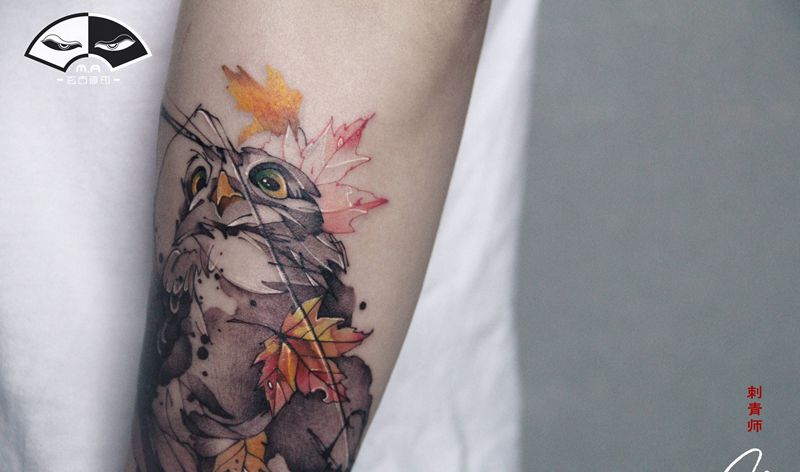 猫头鹰纹身图片_手臂水墨新传统纹身图案
