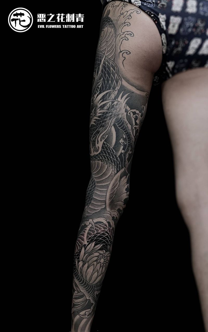 • T网红王老大花腿龙纹身图片_腿部新传统纹身图案