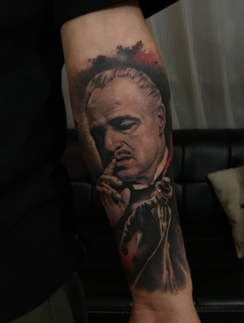 当前位置: 首页 >陕西省西安市纹身店-恶之花刺青工作室纹身图案>教父纹身图片_手部手臂欧美写实教父肖像写实纹身图案