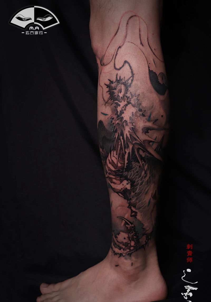 当前位置: 首页 >陕西省西安市纹身店-玄古道印༺࿄࿆༼M.A༽࿅࿆༻纹身图案>《龙》纹身图片_腿部水墨龙纹身图案