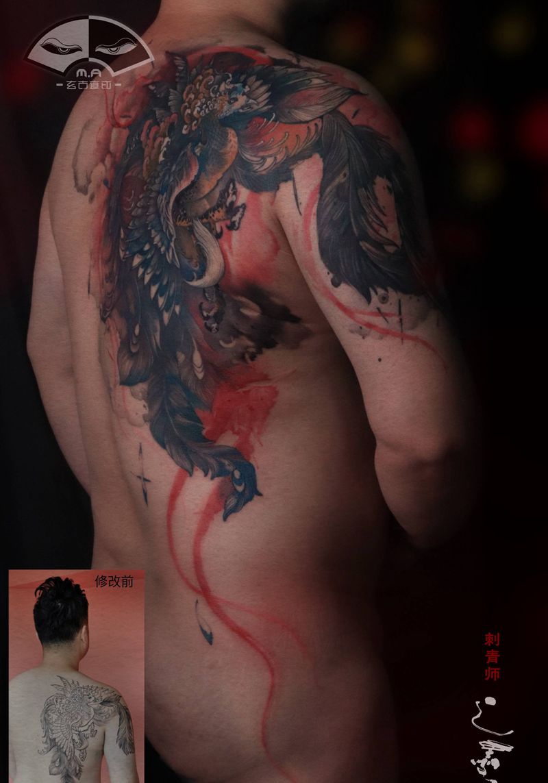当前位置: 首页 >陕西省西安市纹身店-玄古道印༺࿄࿆༼M.A༽࿅࿆༻纹身图案>《涅槃重生》纹身图片_背部水墨凤凰纹身图案