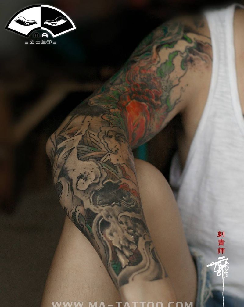《历》言武作品纹身图片_成品手臂传统写意植物原创水墨菊花纹身图案