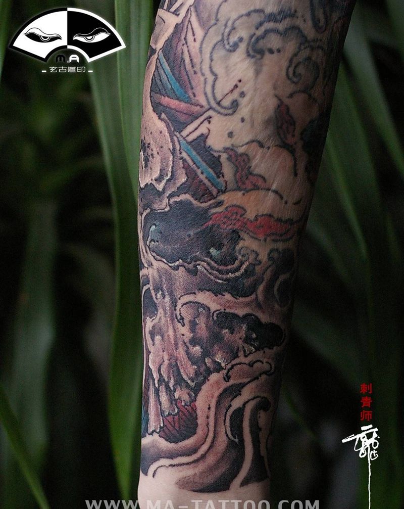 当前位置: 首页 >陕西省西安市纹身店-玄古道印༺࿄࿆༼M.A༽࿅࿆༻纹身图案>《谷涌》言武作品…纹身图片_成品手臂原创骷髅水墨写意水浪纹身图案
