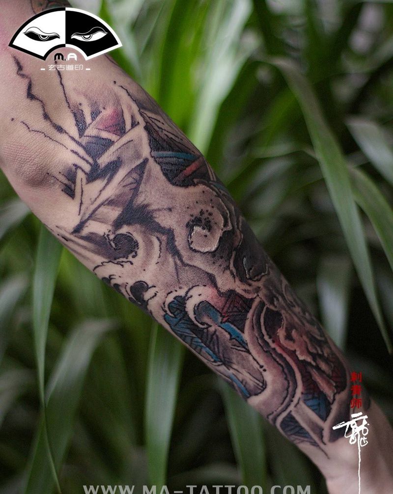 当前位置: 首页 >陕西省西安市纹身店-玄古道印༺࿄࿆༼M.A༽࿅࿆༻纹身图案>《谷涌》言武作品…纹身图片_成品手臂原创骷髅水墨写意水浪纹身图案