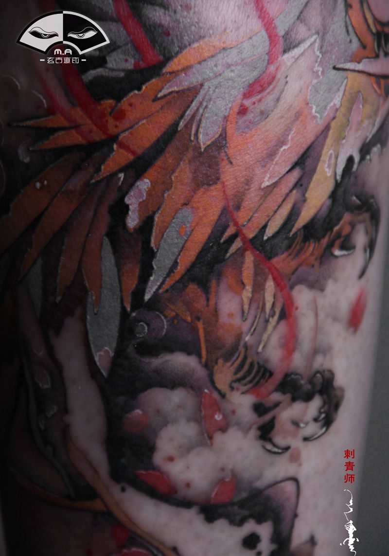 当前位置: 首页 >陕西省西安市纹身店-玄古道印༺࿄࿆༼M.A༽࿅࿆༻纹身图案>《凤凰》纹身图片_腿部水墨凤凰纹身图案