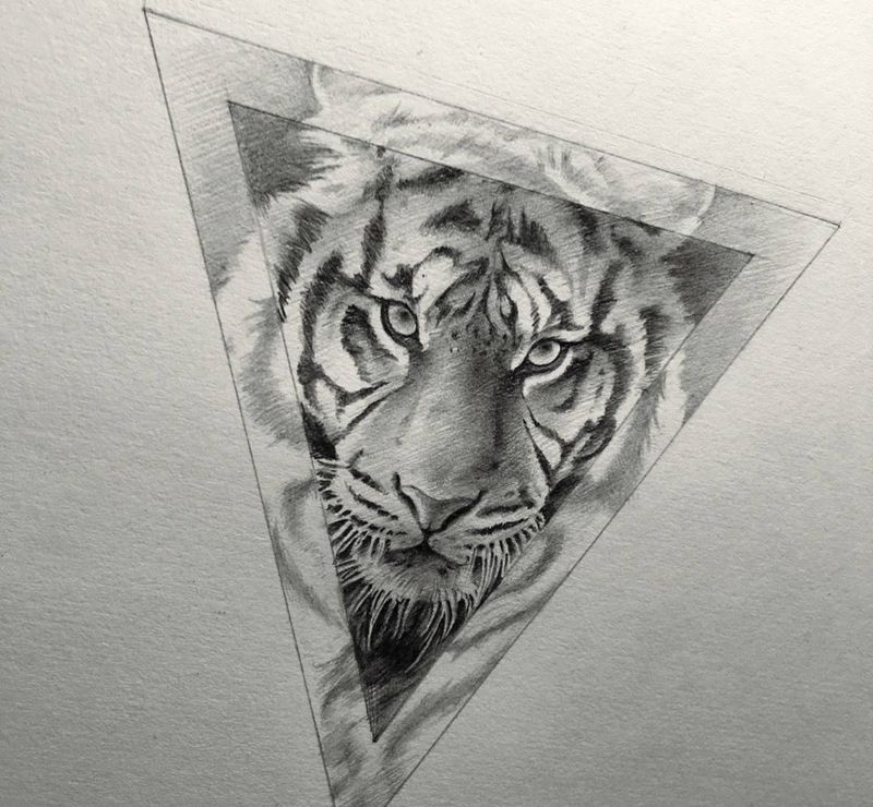 老虎纹身图片_胸部欧美写实几何老虎素描纹身图案