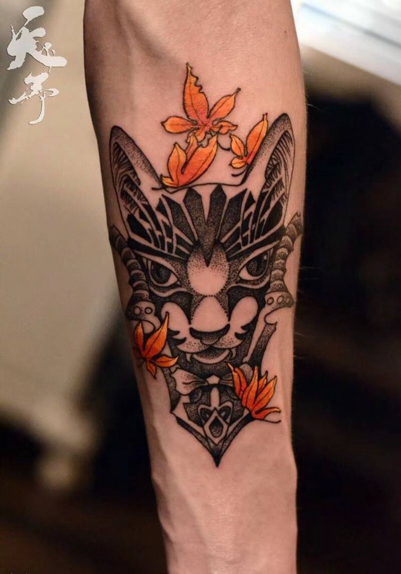 当前位置: 首页 >陕西省西安市纹身店-元极刺青纹身图案>点刺猫纹身图片_成品手臂欧美动物植物黑灰纹身图案