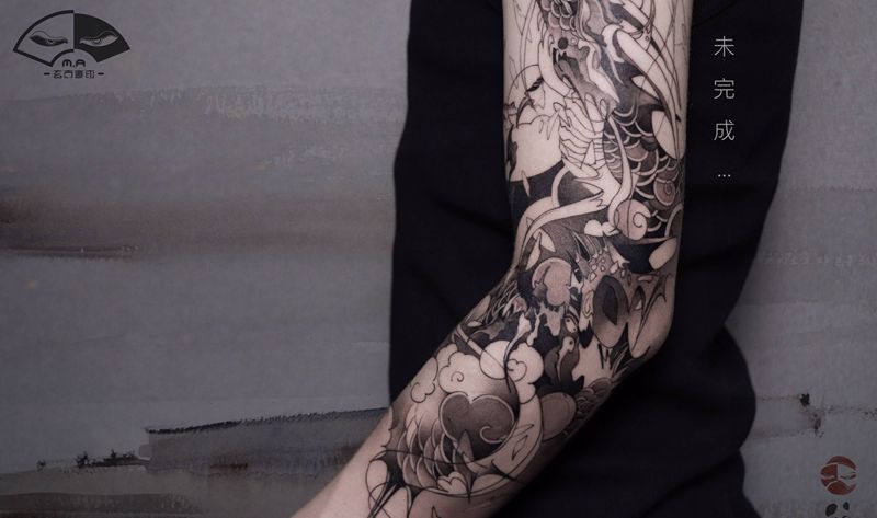 巴别塔纹身图片_手臂水墨龙纹身图案