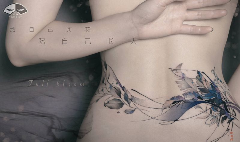 2020.冬纹身图片_腰部背部水墨水彩植物纹身图案