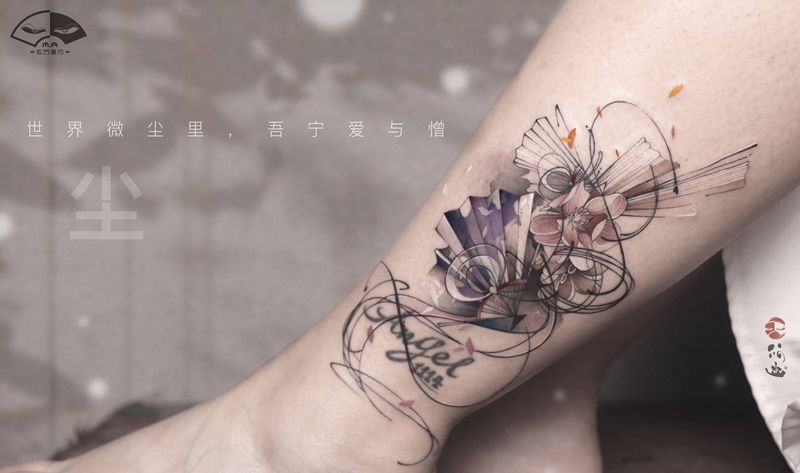 伏线纹身图片_腿部水墨水彩扇子纹身图案