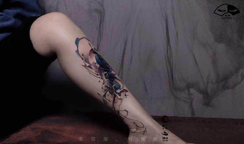 遮盖纹身图片_腿部水墨水彩遮盖纹身图案