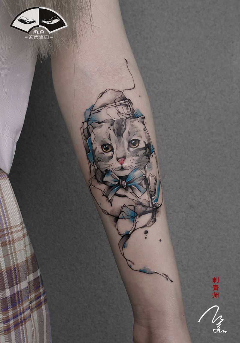 少女心猫咪纹身图片_手臂水彩水墨纹身图案