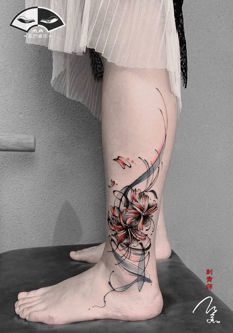 彼岸花纹身图片_脚部腿部水墨水彩纹身图案