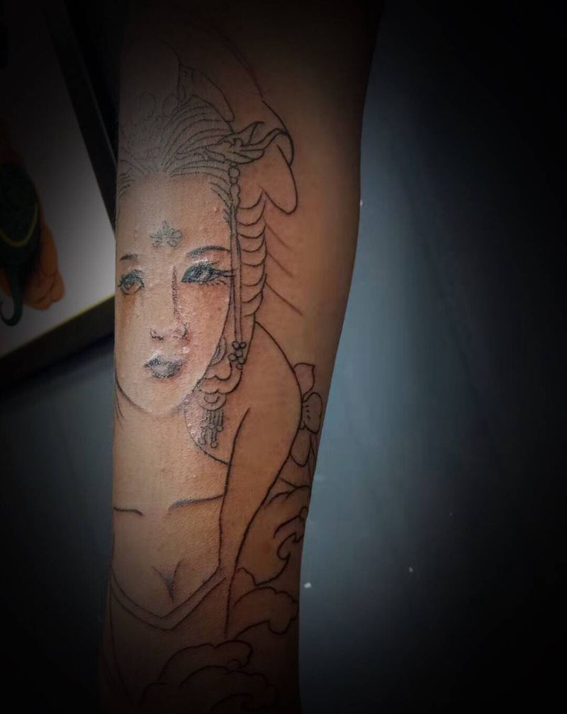 当前位置: 首页 >陕西省西安市纹身店-西少爷刺青艺术馆纹身图案>艺妓(未完成)纹身图片_手臂纹身图案