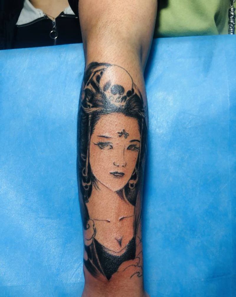 当前位置: 首页 >陕西省西安市纹身店-西少爷刺青艺术馆纹身图案>小臂艺妓纹身图片_手臂新传统纹身图案