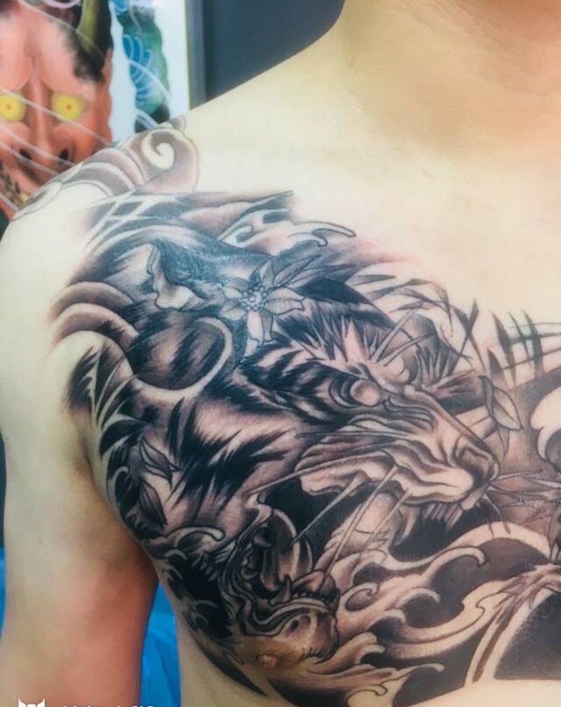 龙虎斗纹身图片_胸部背部新传统纹身图案