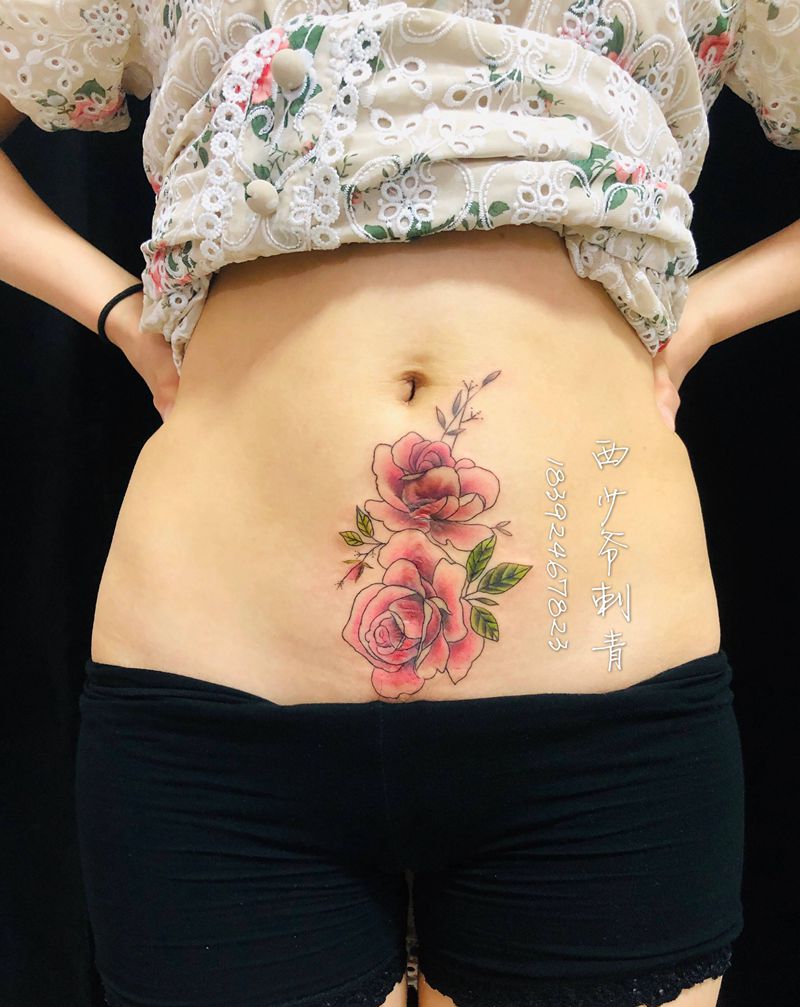 剖腹产遮盖遮盖花纹身图片_腹部新传统纹身图案