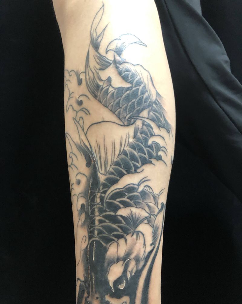 当前位置: 首页 >陕西省西安市纹身店-西少爷刺青艺术馆纹身图案>小腿鲤鱼纹身图片_腿部新传统纹身图案