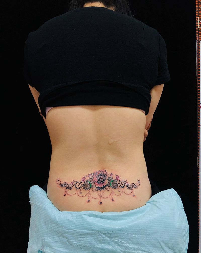后腰蕾丝花纹身图片_腰部新传统纹身图案