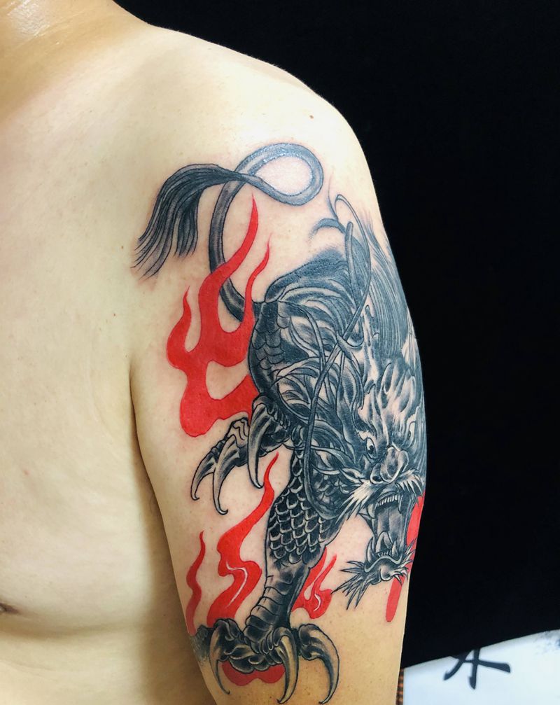 • T网红王老大花腿龙纹身图片_腿部新传统纹身图案