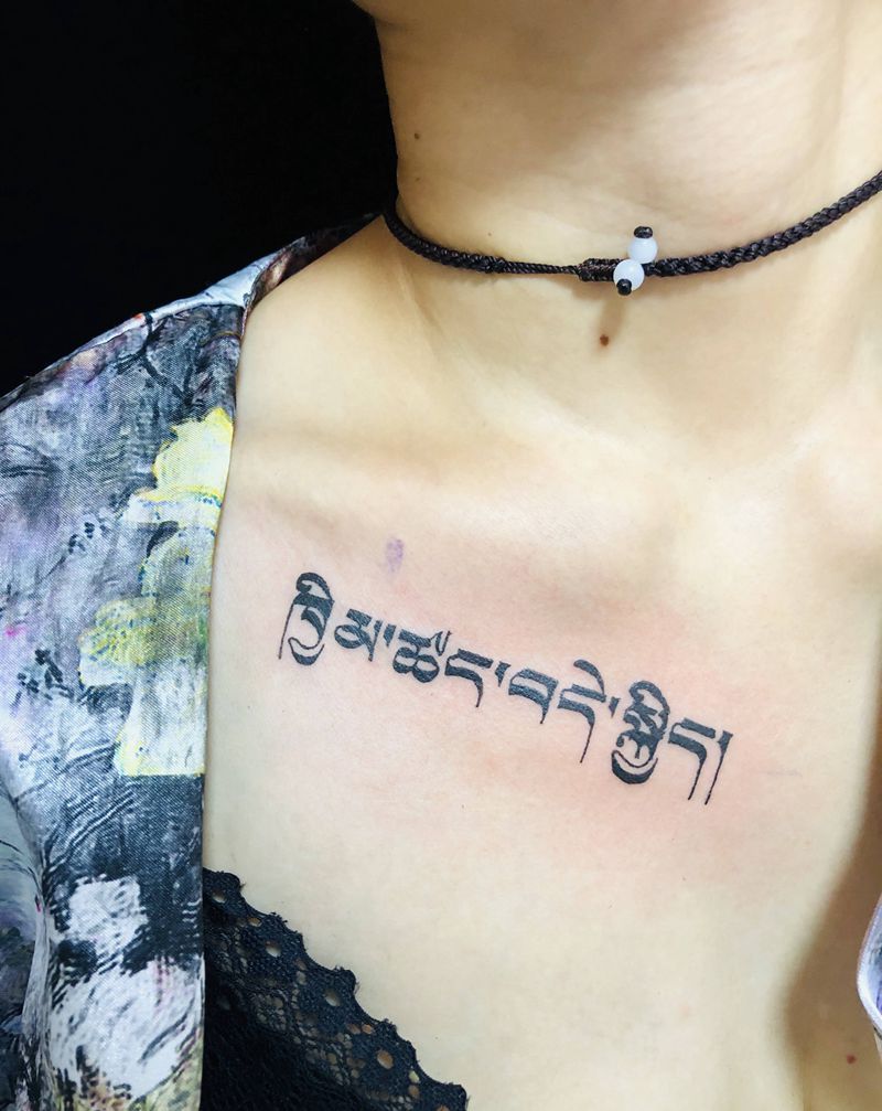 锁骨梵文纹身图片_胸部新传统纹身图案