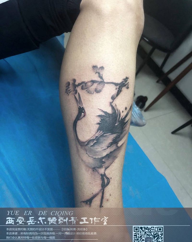 当前位置: 首页 >陕西省西安市纹身店-西安岳尔德刺青纹身图案>鹤纹身图片_腿部水墨纹身图案