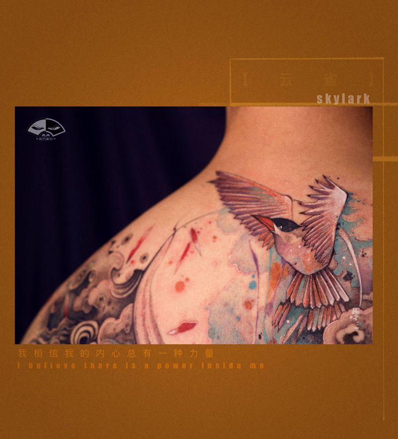 【云雀】纹身图片_背部水墨水彩纹身图案