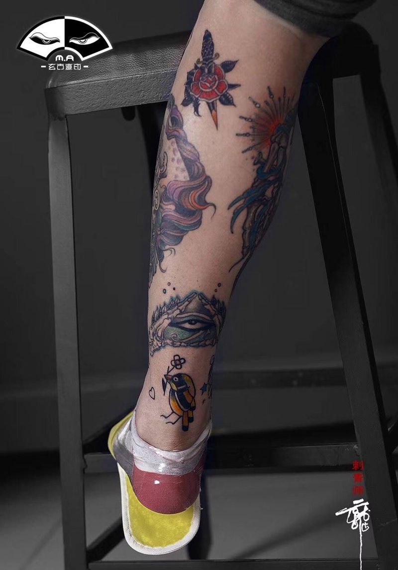 • T包小腿吹火男+阿多福纹身图片_腿部老传统新传统吹火男阿