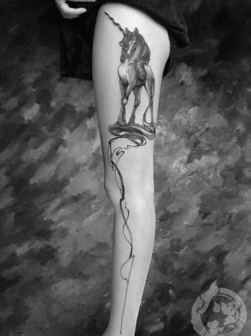 《独角兽》纹身图片_原创植物动物静物国画写实传统腿部臀部成品纹身图案