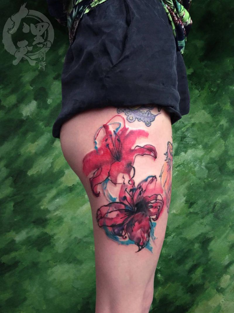 当前位置: 首页 >陕西省西安市纹身店-西安大黑天刺青纹身图案>百合花纹身图片_成品臀部腿部国画习俗原创植物清新纹身图案