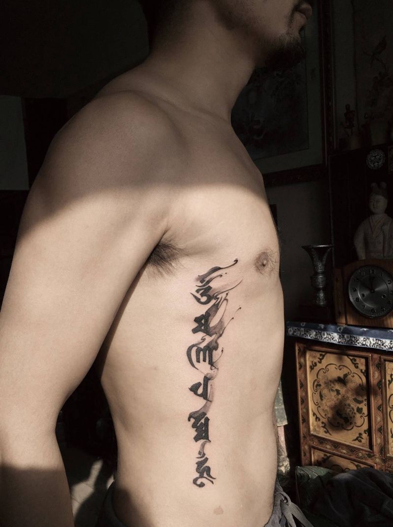 当前位置: 首页 >陕西省西安市纹身店-西安大黑天刺青纹身图案>六字箴言纹身图片_原创几何字符宗教写实清新腰部腹部成品纹身图案