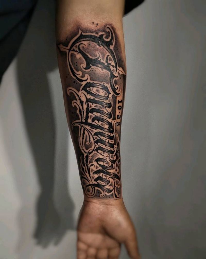 当前位置: 首页 >陕西省宝鸡市纹身店-暴走刺青纹身图案>奇卡诺花体纹身图片_手臂花体字纹身图案