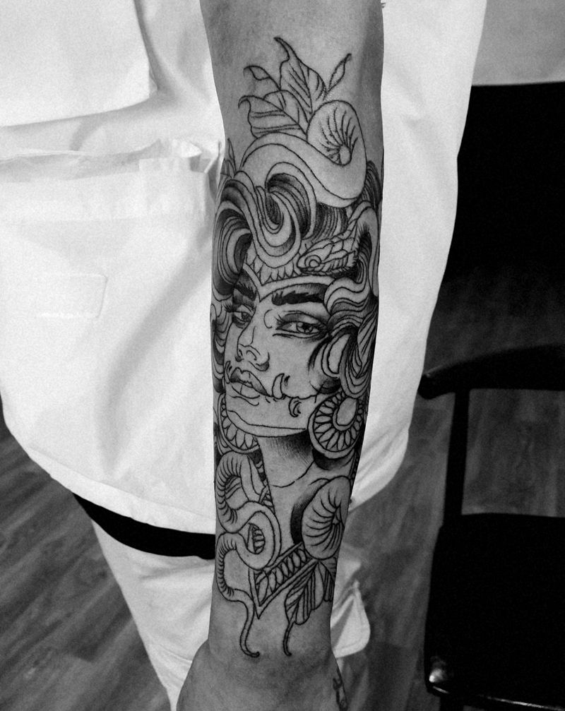 当前位置: 首页 >陕西省西安市纹身店-弘勋刺青纹身图案>美杜莎纹身图片_手臂手部老传统新传统纹身图案