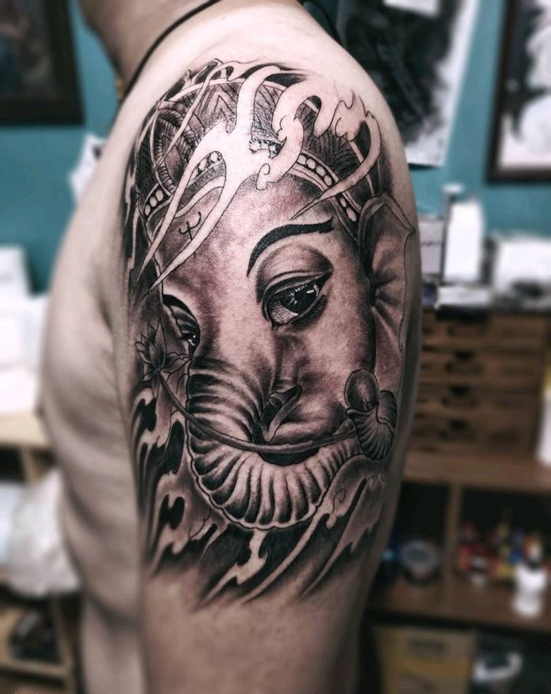 当前位置: 首页 >陕西省西安市纹身店-弘勋刺青纹身图案>象神纹身图片_手臂新传统纹身图案