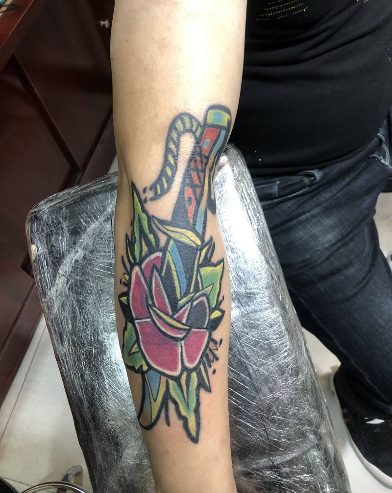 当前位置: 首页 >陕西省西安市纹身店-西安禅门刺青纹身图案>遮盖纹身图片_手臂Old School纹身图案