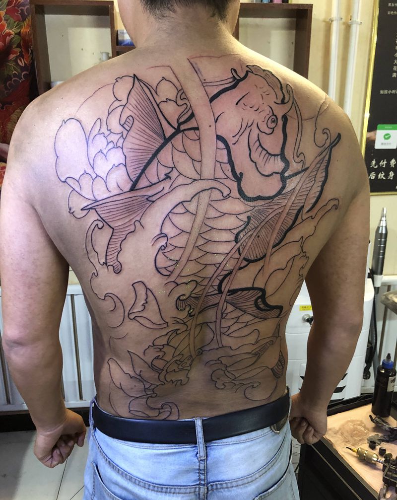 满背鲤鱼线纹身图片_背部新传统纹身图案