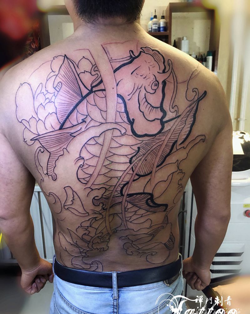 当前位置: 首页 >陕西省西安市纹身店-西安禅门刺青纹身图案>满背鲤鱼线纹身图片_背部新传统纹身图案