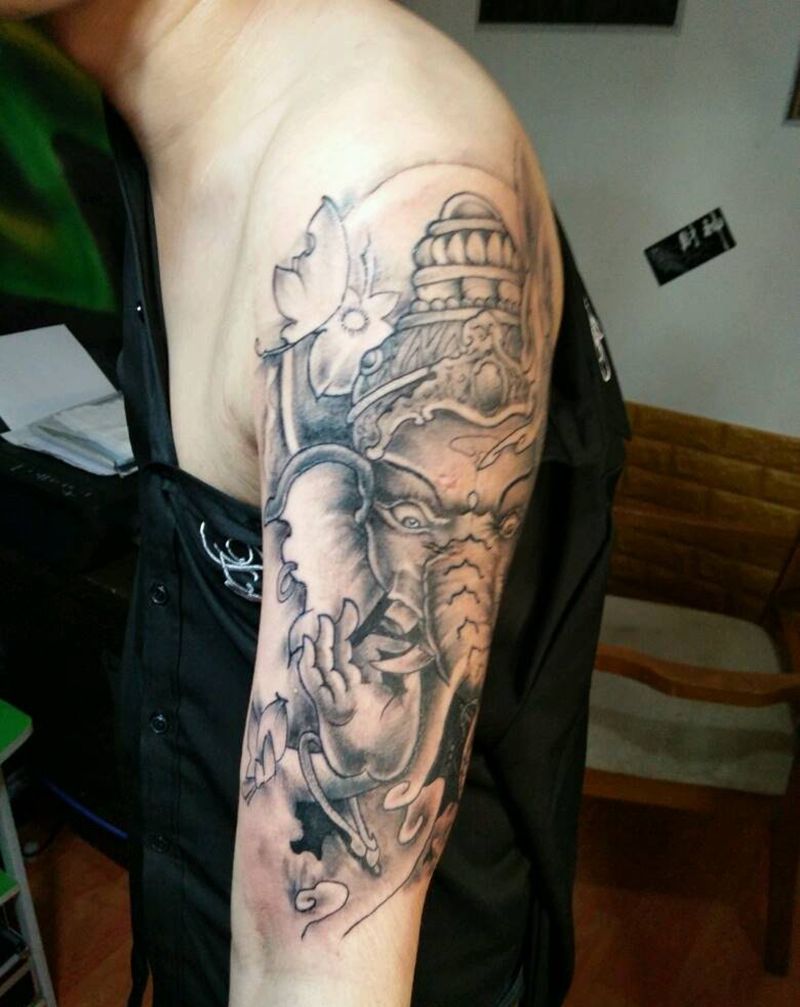 当前位置: 首页 >陕西省西安市纹身店-西安禅门刺青纹身图案>大臂象神纹身图片