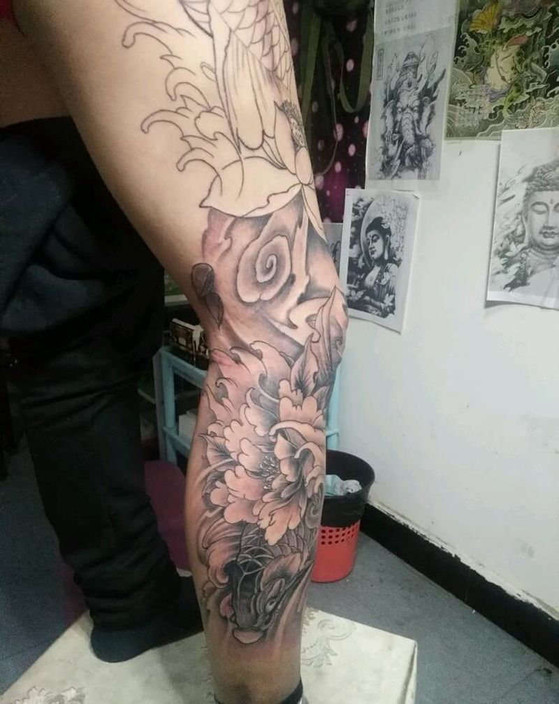 当前位置: 首页 >陕西省西安市纹身店-西安禅门刺青纹身图案>鲤鱼包半腿,未完纹身图片