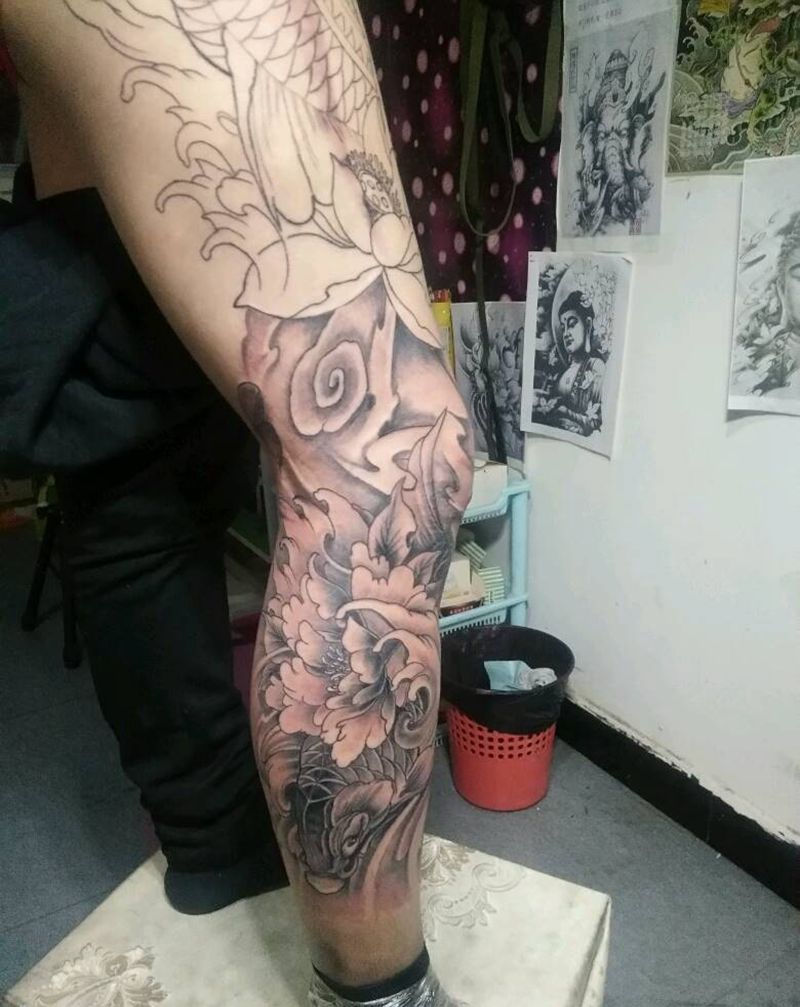 当前位置: 首页 >陕西省西安市纹身店-西安禅门刺青纹身图案>鲤鱼包半腿,未完纹身图片