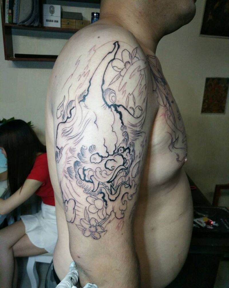 当前位置: 首页 >陕西省西安市纹身店-西安禅门刺青纹身图案>半甲唐狮大日如来线条未完成纹身图片