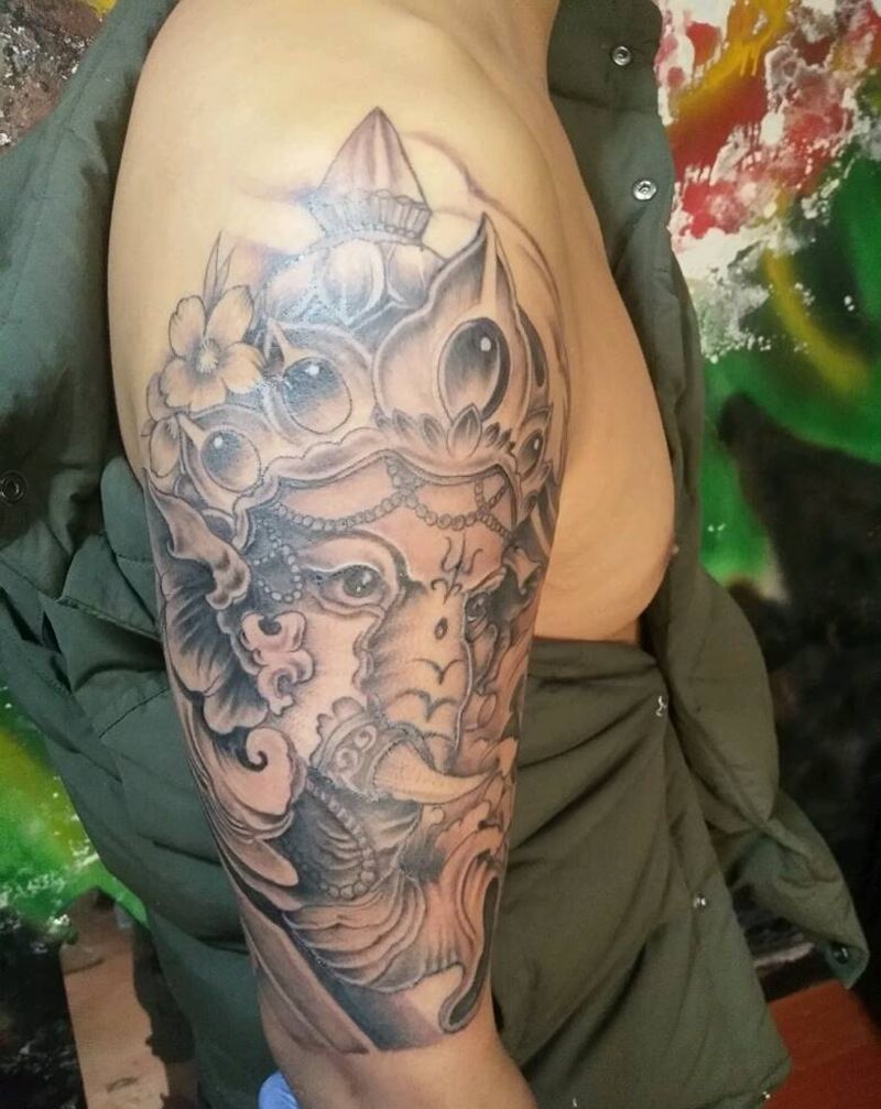 当前位置: 首页 >陕西省西安市纹身店-西安禅门刺青纹身图案>大臂象神纹身图片