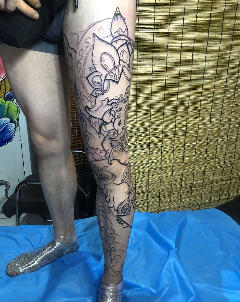 当前位置: 首页 >陕西省西安市纹身店-西安禅门刺青纹身图案>花腿象神线条纹身图片_腿部新传统纹身图案