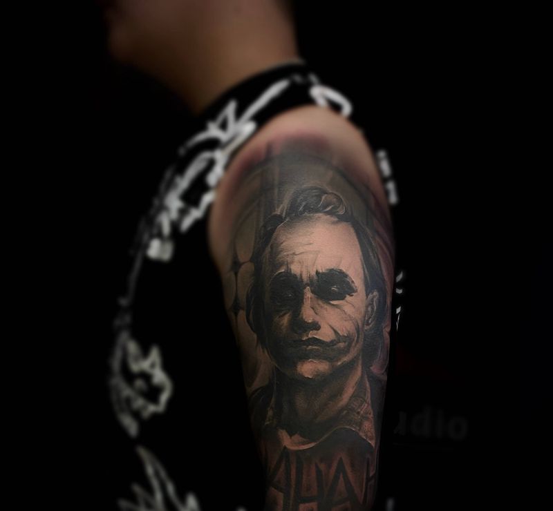 当前位置: 首页 >陕西省西安市纹身店-乾言刺青纹身图案>joker小丑纹身图片_手臂欧美写实纹身图案